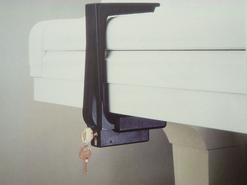 Beautifully constructed fallboard lock with self-contained locking device. Made of high density, durable jet-age plastic. Black in color, lined black felt to protect piano finish. Has 6" (15cm) opening and comes with 2 pre-drilled shims to adjust height. Superior quality. Comes complete with built-in Masterlock and 2 keys.