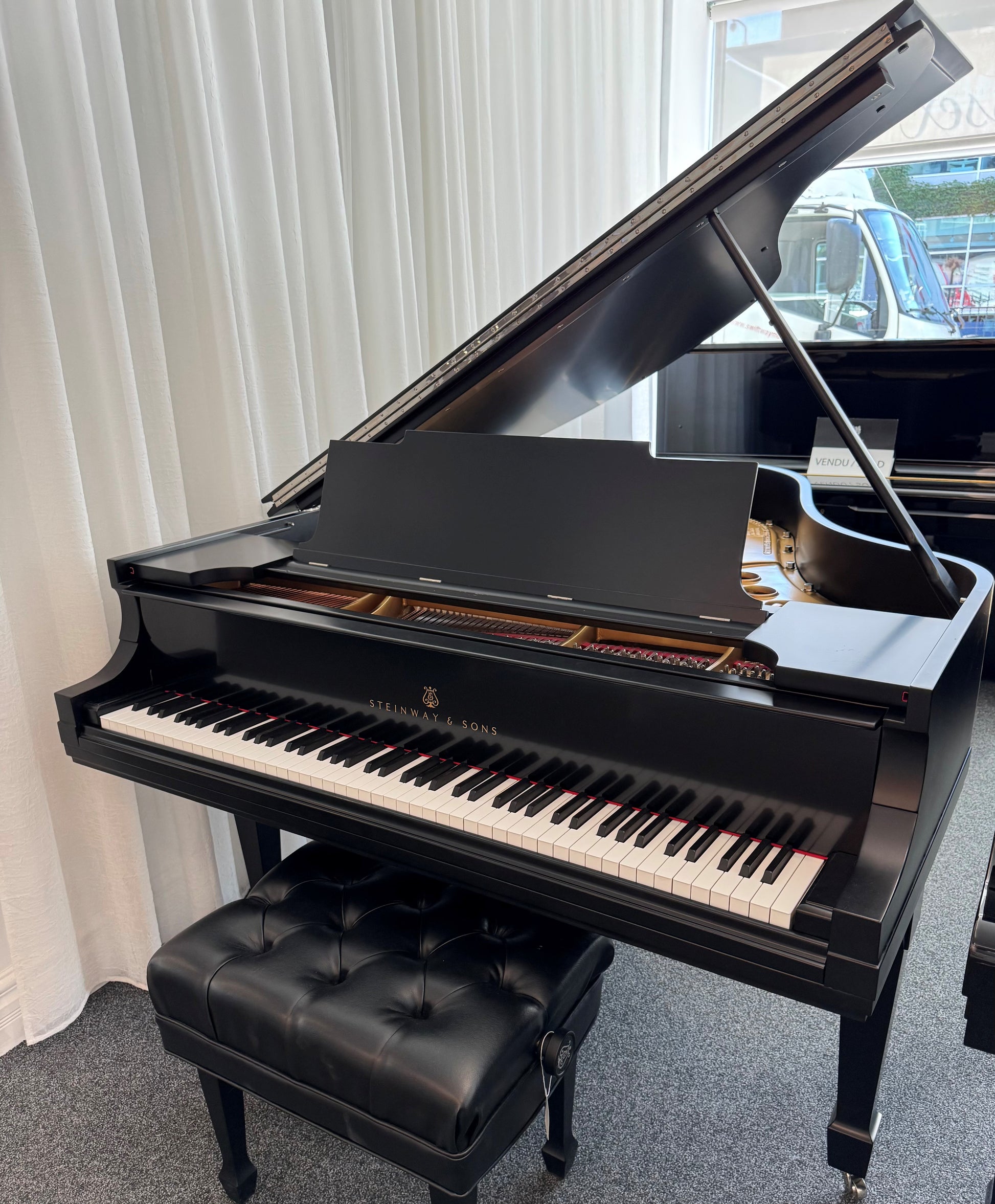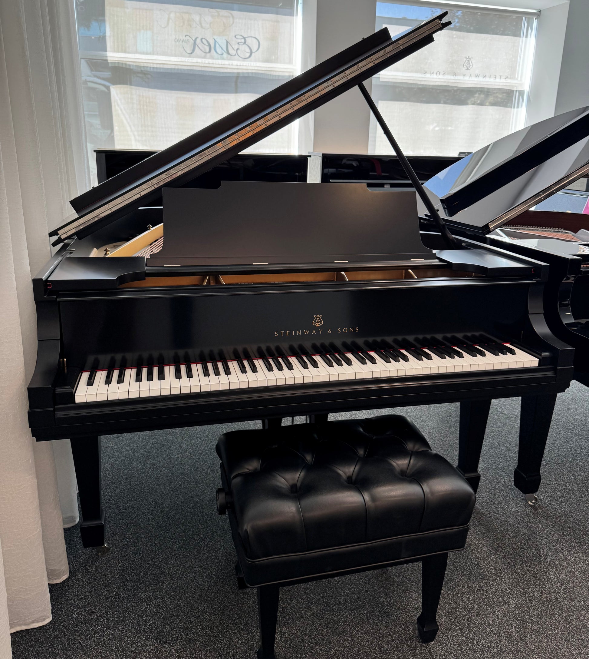 All internal components have been replaced such as the soundboard, pinblock, the keyboard frame (Kluge) including new white keys and real ebony black keys. The strings, tuning pins, and all action parts have been replaced with original Steinway & Sons parts. The new satin black finish (35% gloss) has been applied over a polyester base. The hardware is nickel-plated to ensure everlasting luster. The adjustable Jansen bench is included.