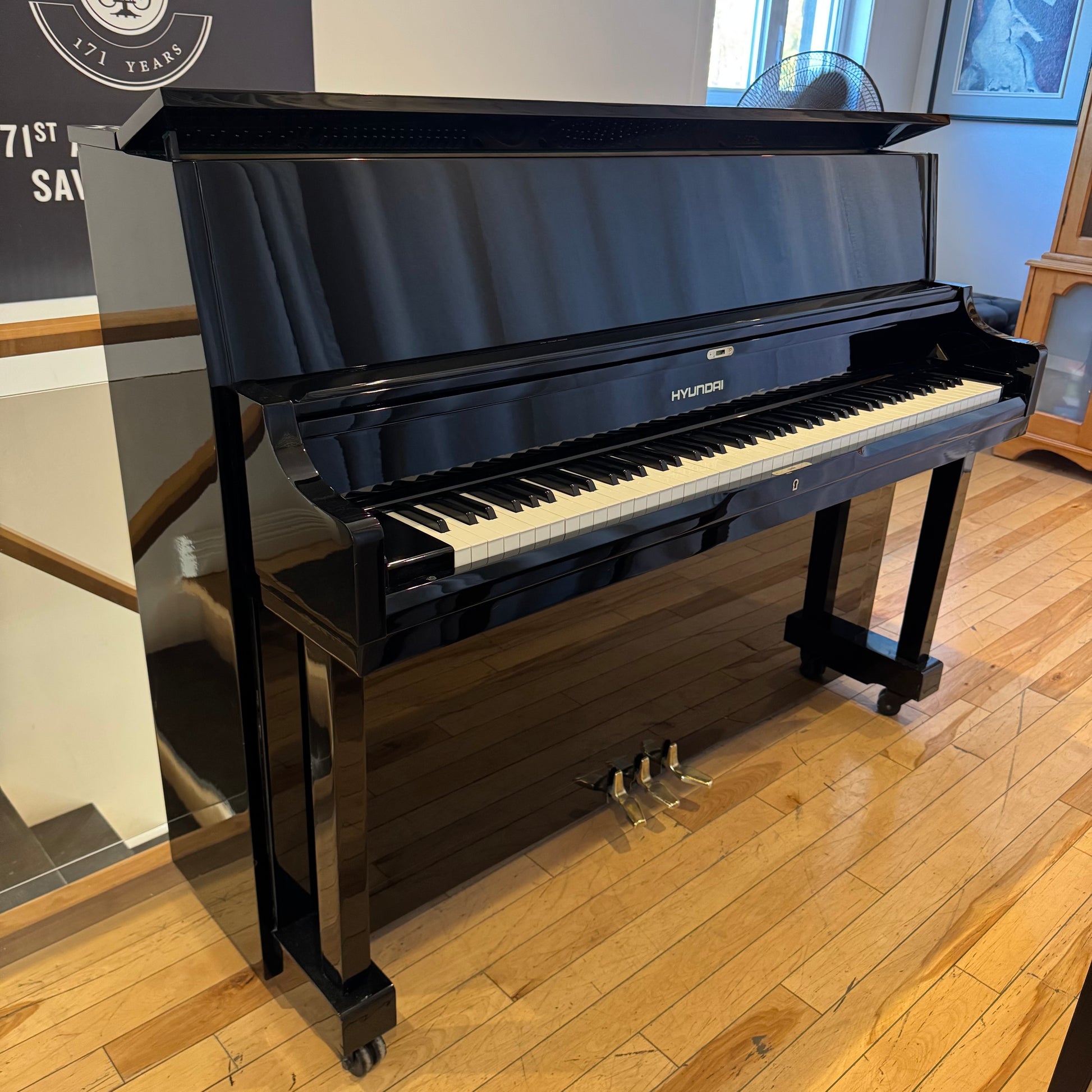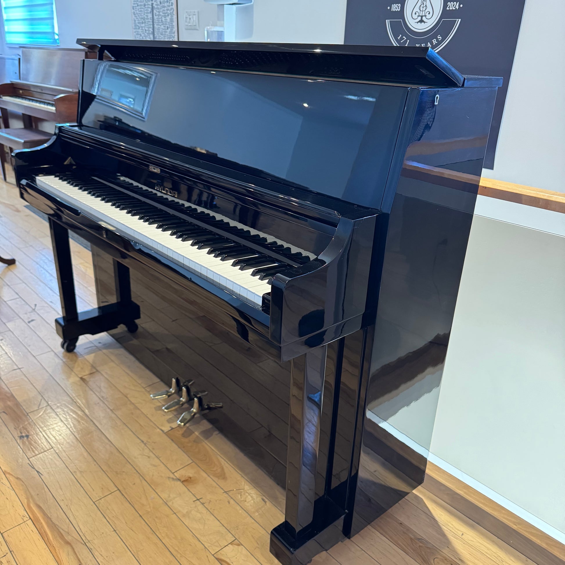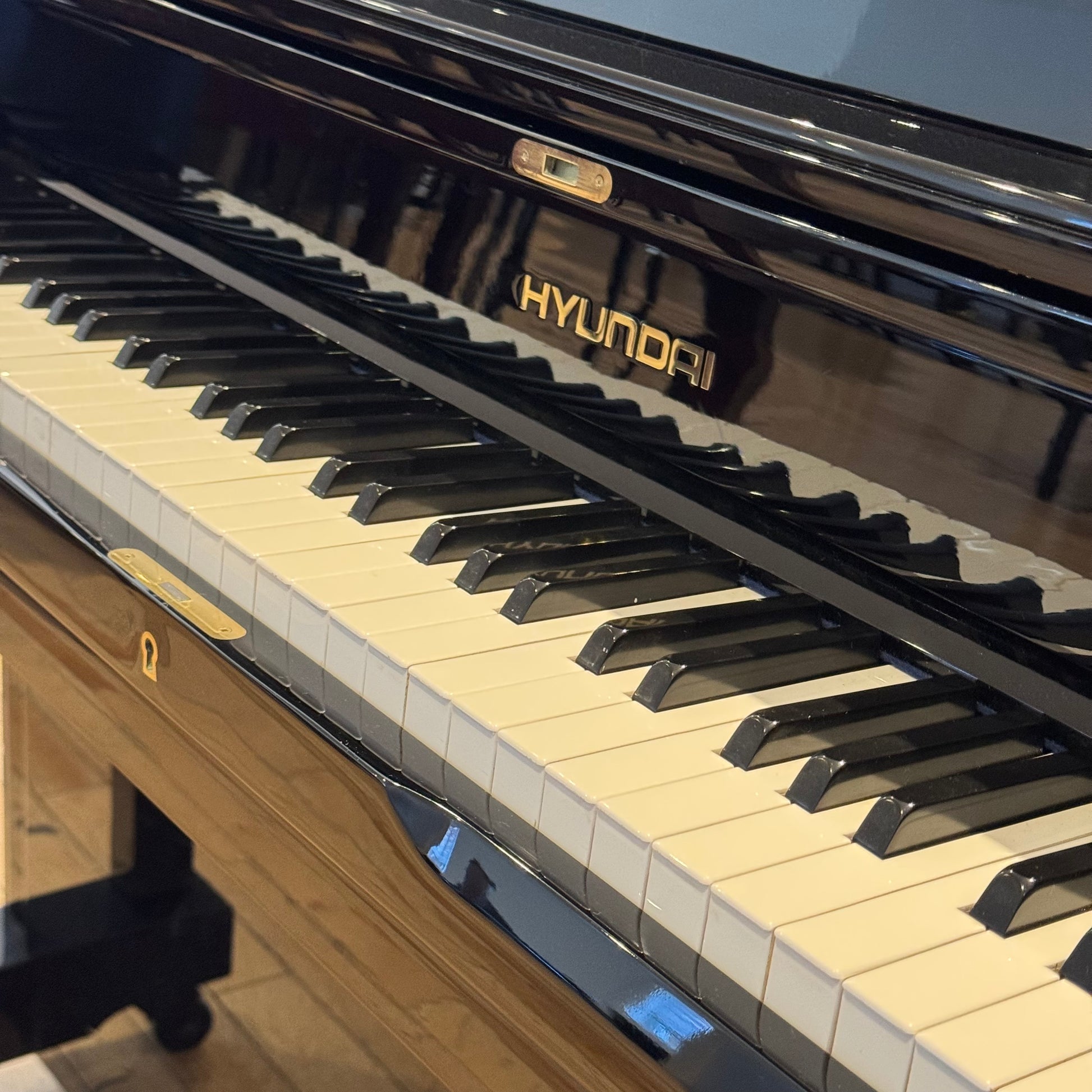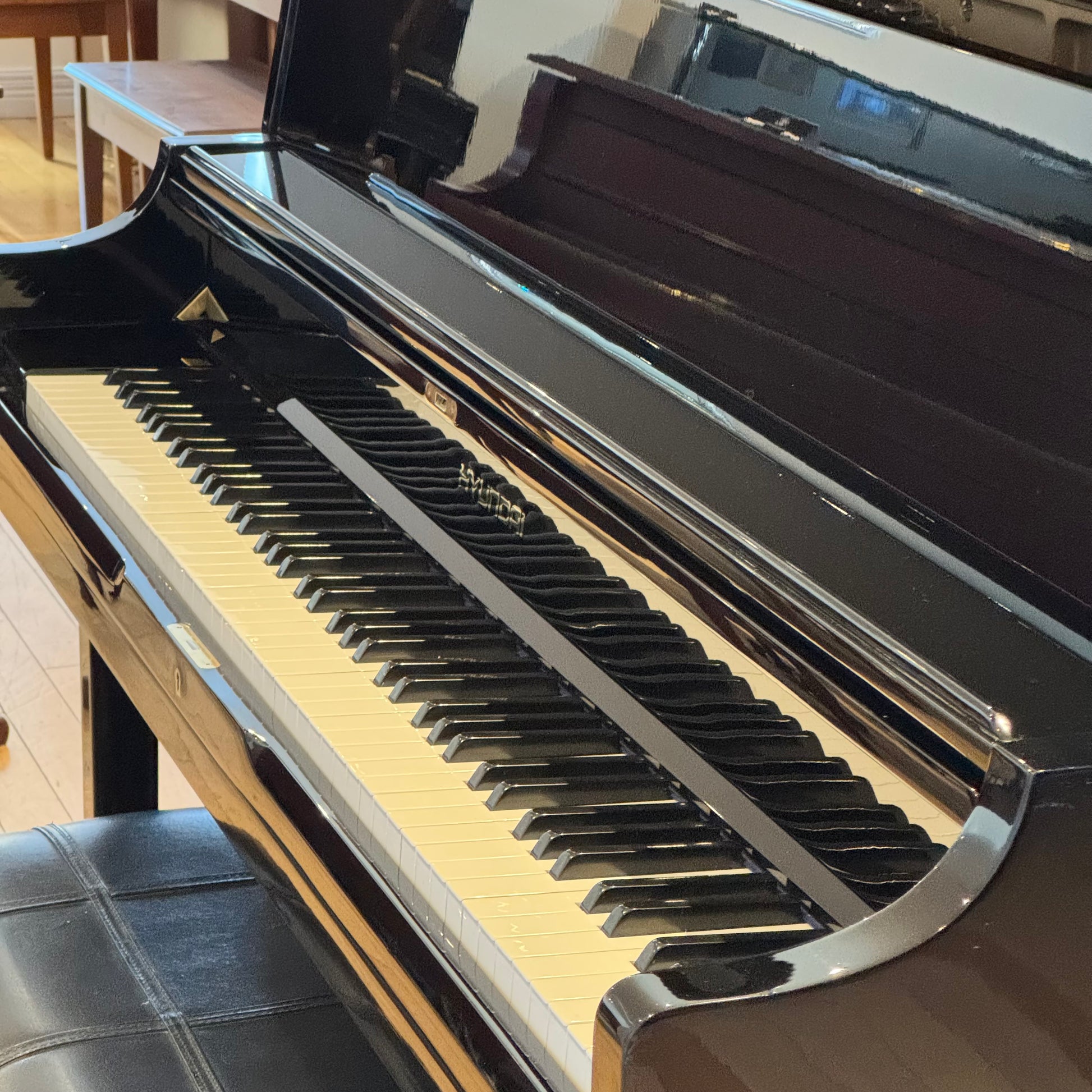 Piano droit Hyundai modèle U852 noir lustré. Fabriqué en Corée en 1988 avec banc assorti. Garantie 3 mois.